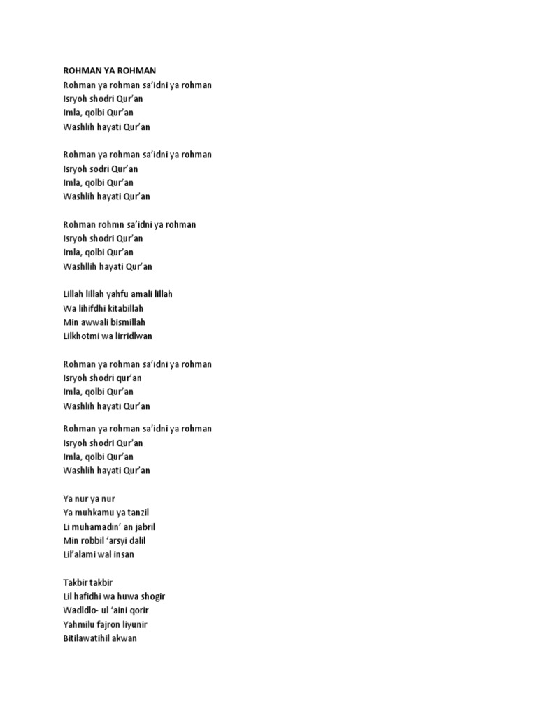 Lirik Lagu Rohman Ya Rohman Syubbanul Muslimin - Rohman Ya Rohman Lirik By Lima Limo : Daftar lirik grup & penyanyi religi;. Ramadhanmu lyrics ya robbi dalam beriman ku bersimpuh kepadamu ampuni hamba ya rohman dosa dosa masa lalu sombong hasut dan benci dalam hati berkuasa dengan . home movie. Lirik lagu majelis syubbanul muslimin ya kitabal ghuyub. Lirik lagu sholawat rahman ya rahman versi sabyan yang dinyanyikan oleh nisa sabyan. Assalamualaikum, syukron buat 12 ribu pelanggannya, maaf baru bisa upload. Sholawat terbaru nissa sabyan ini juga dibawakan dengan nada santai dan merdu.